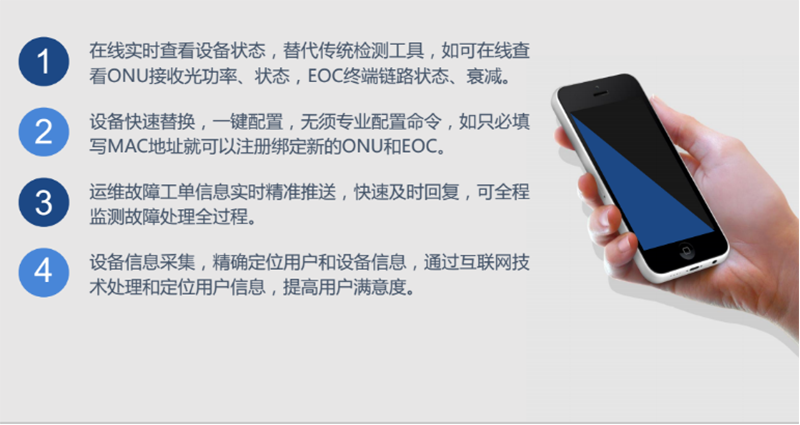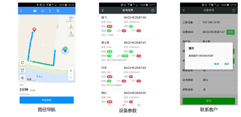 手機(jī)移動(dòng)端可以規(guī)劃運(yùn)維路徑,設(shè)備鏈路狀態(tài)和運(yùn)行狀態(tài),調(diào)用撥號(hào)功能可以便捷聯(lián)系客戶,掃描終端MAC可以實(shí)現(xiàn)快速更換,無(wú)需專業(yè)命令配置。